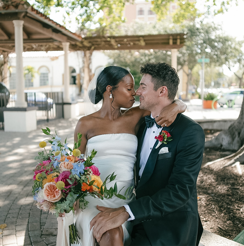 As Perpetua walked down the aisle, all eyes were on her. Her wedding attire was a masterpiece of modern bridal fashion. A minimalist gown with a striking silhouette and subtle details exuded elegance, while her chic updo and statement earrings added a touch of glamour that perfectly complemented the day's aesthetic. The sleek silhouette of her gown was accentuated by the vibrant floral details, echoing the lively spirit of the day.